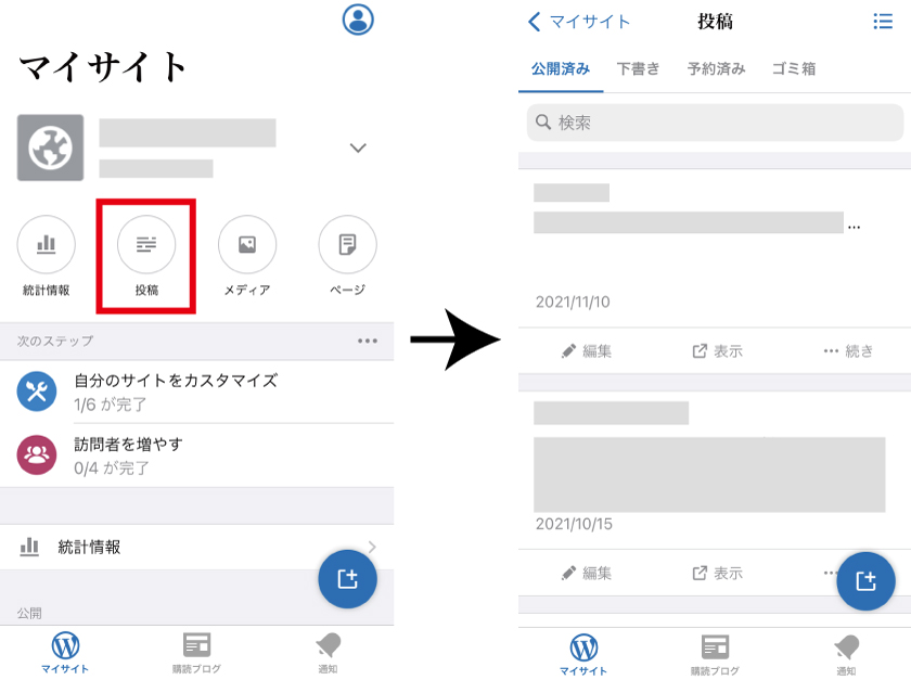 「投稿」をタップすると、投稿一覧画面が表示されます。こちらから記事を編集・削除など行っていただけます。