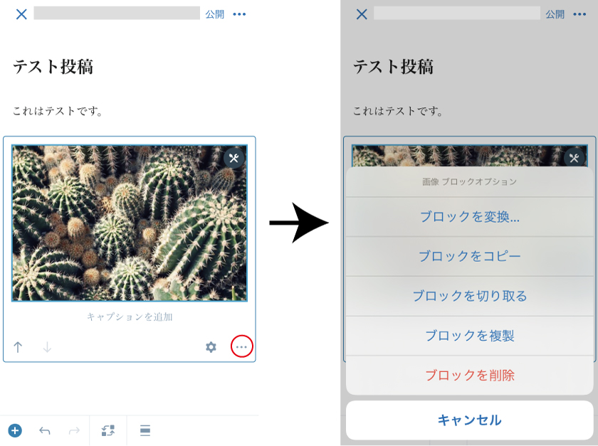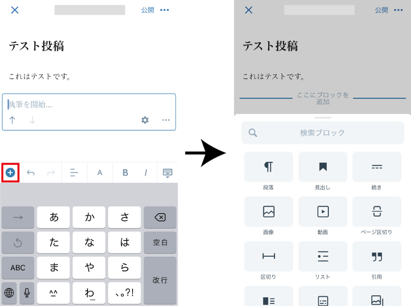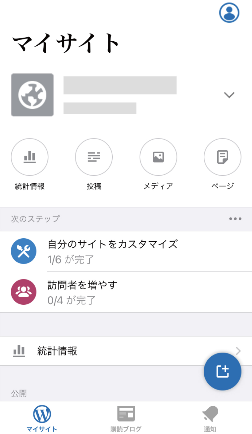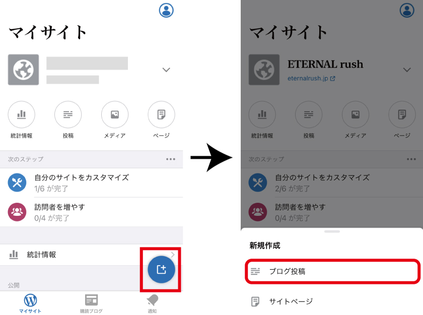 WordPressアプリを起動したら、右下のアイコンをタップし、「ブログ投稿」を押してください。